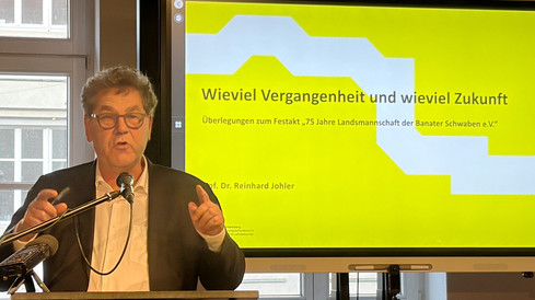 Einen rückblickenden und zugleich zukunftsweisenden Akzent setzte der Festvortrag von Prof. Dr. Reinhard Johler vom Institut für donauschwäbische Geschichte und Landeskunde. Unter dem Leitgedanken des Verhältnisses von Vergangenheit und Zukunft sprach er über Erinnerungskultur, kulturelles Erbe und die Verantwortung der Landsmannschaften als Vermittler zwischen Herkunftsregionen und Gegenwart. Besonders große Aufmerksamkeit fand sein Impuls, junge Menschen stärker einzubinden und neue Formen der Sichtbarkeit und Vernetzung zu entwickeln.